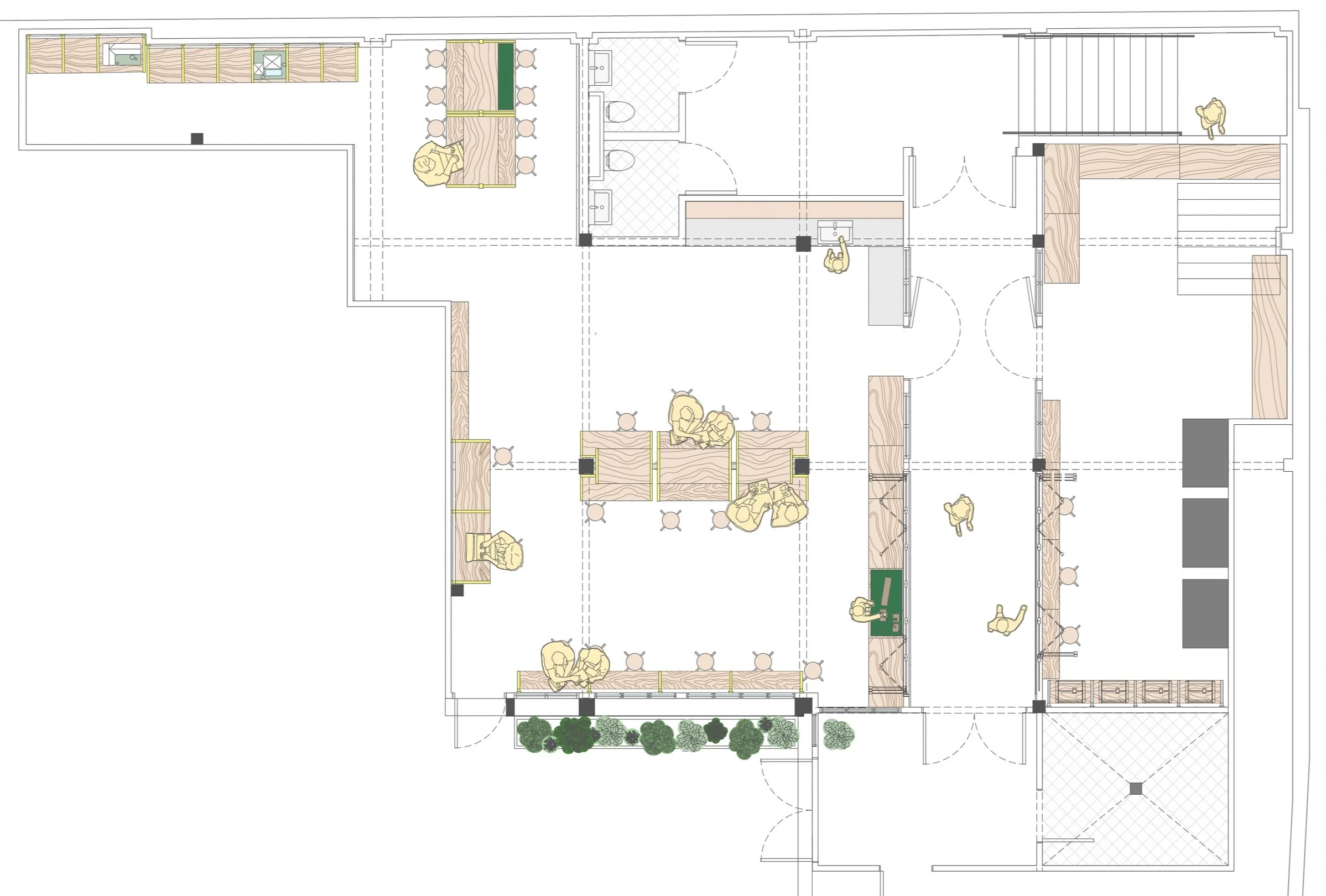 Plans and elevations were my main responsibility in the project. We moved the hallway and trashroom, which gave us access to all the windows of the fasade. This increased the natural light into the space, which we didn’t want to block. Instead, we created a hallway with windows, bridging both light and communication across what would otherwise be a very domintating divider.