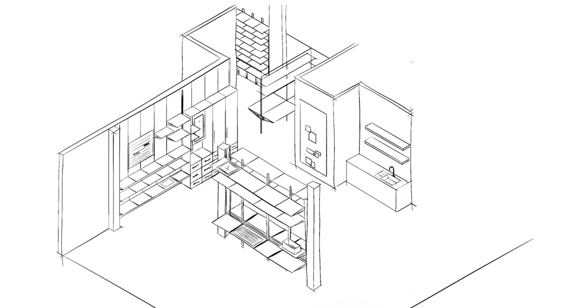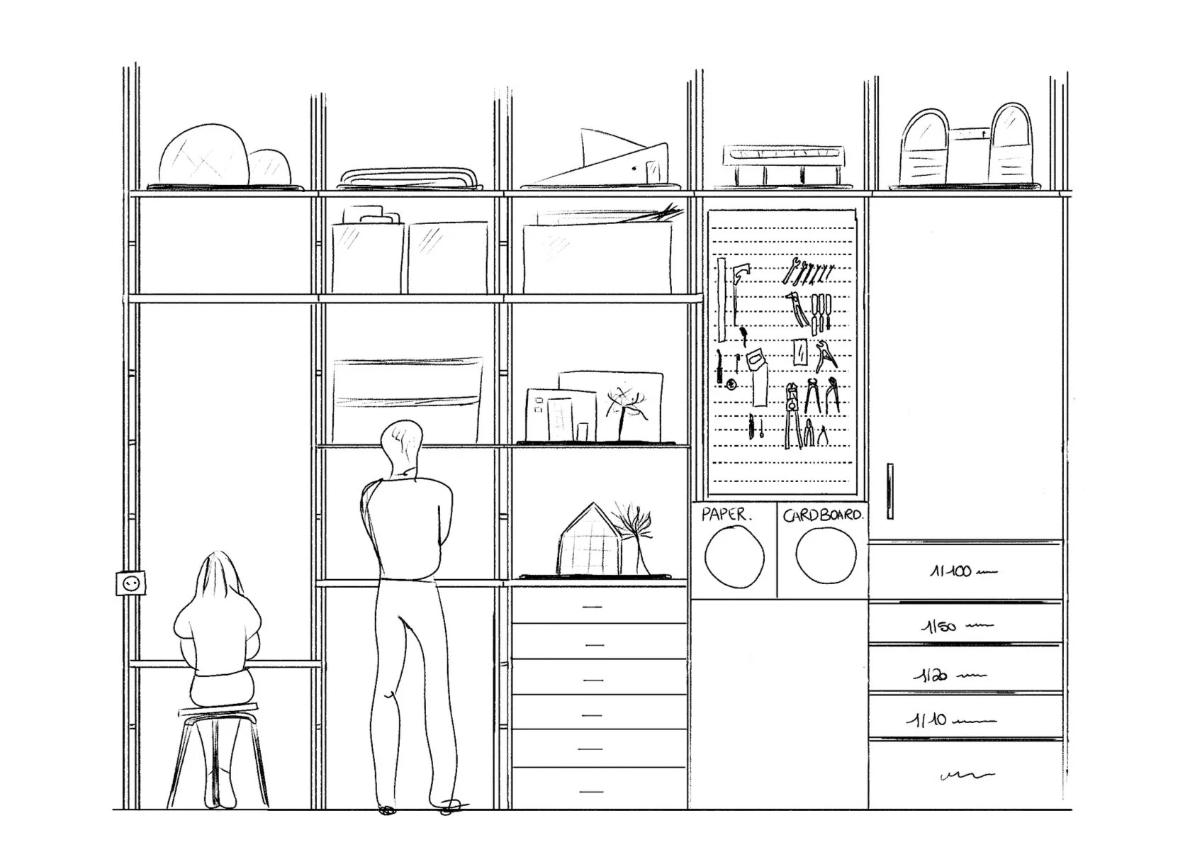 The workshop is created with modelmaking and resources in mind. Each shelf can come off, making changing worktops easy, as well as transporting models to and from the storage. There would be electrical outlets on all the structures, making use of smaller tools, such as glue guns and dremmels easy at your workstation. Niche tools and instructions on how to create realistic effects would be available to the students as well as a library of miniature furniture, people etc. that the students could borrow, leaving more time for the crative process.